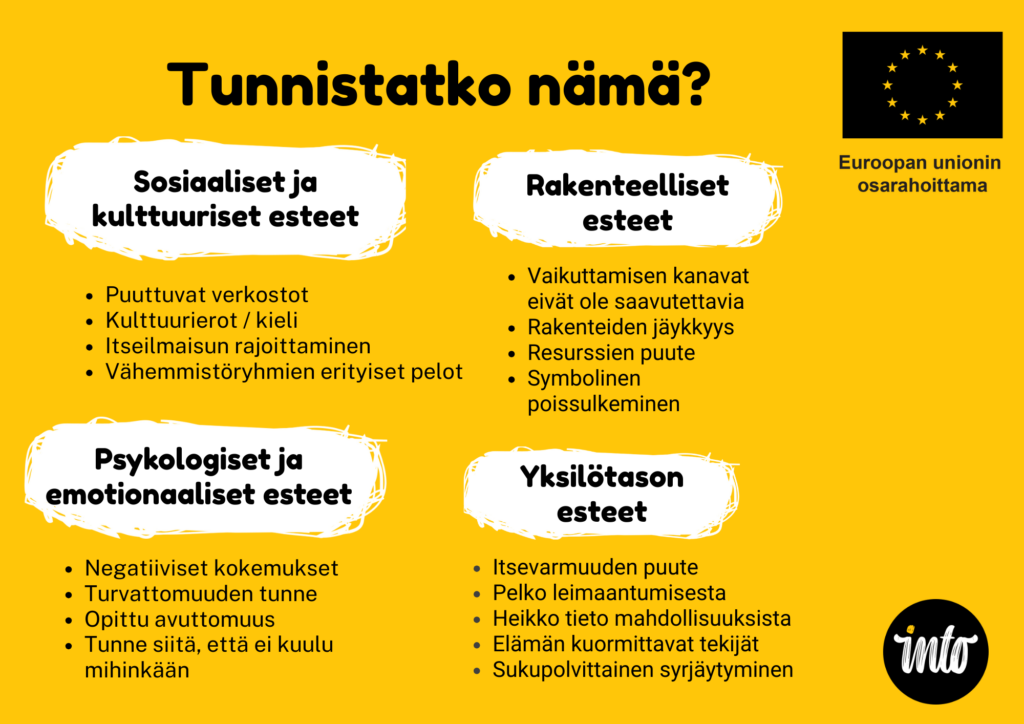 Traumataustat ja pelko altistumisesta voivat tehdä osallistumisesta uhkaavan kokemuksen. Vaikuttamiseen liittyvä julkisuus, uusien ihmisten kohtaaminen tai aiempien kokemusten varjo voivat nostaa esiin turvattomuuden tunteen. Moni on sisäistänyt ajatuksen, että hänen kuuluu olla hiljaa. Jos oman mielipiteen esittäminen on johtanut rangaistukseen, häpeään tai mitätöintiin, kynnys osallistua kasvaa lähes ylittämättömäksi.