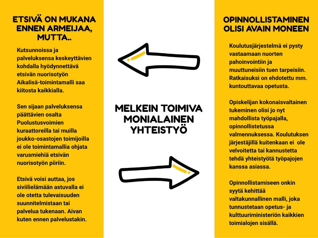 Monialainen yhteistyö ja nuorten palvelut alueellisella ja paikallisella tasolla kärsivät siitä, että eri hallinnonalat valtion tasolla eivät suunnittele tulevia uudistuksia, rahoituksia ja palveluja alusta lähtien yhdessä. Koordinaation puute tuottaa ennakoimattomia, negatiivisia ja ei-tarkoitettuja vaikutuksia, joiden nyt huomataan kumuloituvan ennen näkemättömillä tavoilla. Hinnan tästä maksavat lopulta ne kansalaiset, jotka tarvitsisivat asiakaslähtöisiä, oikea-aikaisia palveluita.