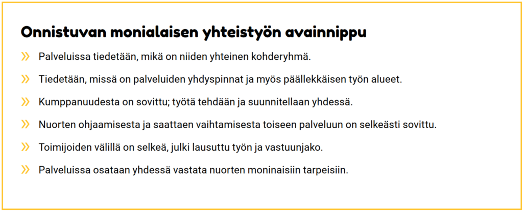Palvelupolkujen ja -prosessien optimoinnin sijaan monialaisessa yhteistyössä on kiinnitettävä huomiota kohderyhmän moninaisiin tarpeisiin. Vain ymmärtämällä kohderyhmää kokonaisvaltaisesti voidaan kehittää palveluja ja niiden rahoitusta oikein. Siilouttamisen ja rajanvedon sijaan tulisikin käydä keskustelua siitä, miten erilaiset palvelut yhdessä ja erikseen pystyvät vastaamaan esimerkiksi nuorten nykyisiin tuentarpeisiin.