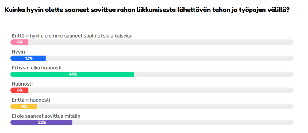 Osallistujista 32% oli erittäin tyytyväisiä ja tyytyväisiä opinnollistamiseen liittyvään yhteistyöhön työllisyysalueen tai -palveluiden kanssa. Puolestaan 30% osallistujista oli erittäin tyytymättömiä tai tyytymättömiä yhteistyöhön. Osallistujat kuvailivat työpajan roolia ammatillisen koulutuksen yhteistyötahona mahdollistajaksi, tarpeelliseksi ja tukevaksi.